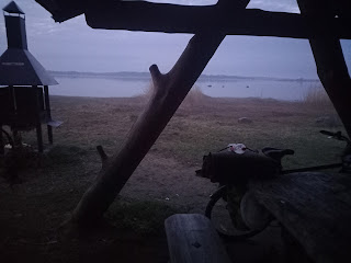 Vor allem aber war es nun schon richtig düster, und zu allem Überfluss tröpfelte es leicht vom Himmel. Auf dem Rückweg bog ich ab zu einem kleinen Bootshafen. Eigentlich hatte ich gedacht, dort werde ich eher gestört als auf der geheimnisvollen Schlossinsel, aber das Gegenteil war der Fall - kein Schwein war dort, die Handvoll Boote lagen einsam herum, und wie es die App versprochen hatte, erwarteten mich ein Aussichtsturm, viele Grills und jede Menge Rasthütten als Regenschutz. Wunderbar, danke, Hafen!